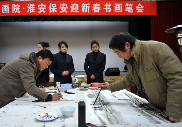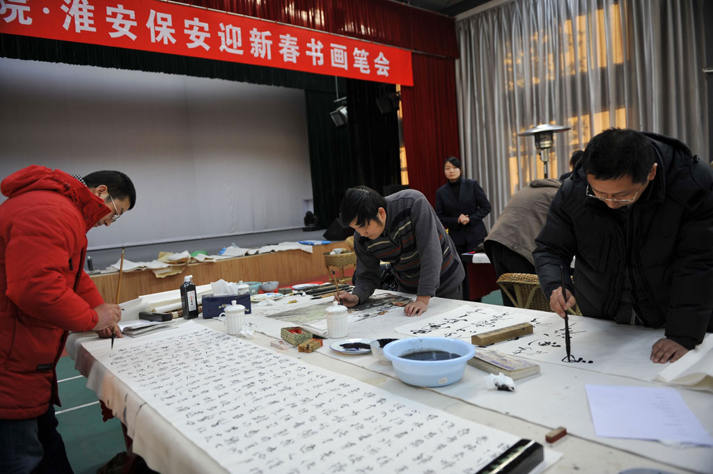 元月16日下午,由淮安書畫院和總公司聯(lián)合舉辦的“迎新春書畫筆會”活動在公司活動中心舉行。公司總經(jīng)理婁伯翱、副總經(jīng)理王克、徐文剛和各部門負(fù)責(zé)人蒞臨活動現(xiàn)場,部分保安隊(duì)伍和押運(yùn)隊(duì)伍中的書畫愛好者到現(xiàn)場觀摩學(xué)習(xí)。會上,書畫們齊集一堂,創(chuàng)作了一幅幅書畫精品,彰顯了保安文化特色,贏得了在場觀摩者們的贊賞與好評。