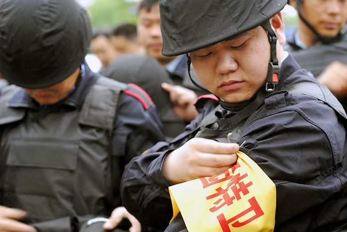 2010年5月5日早晨6時(shí)許,全副武裝的校園特衛(wèi)人員整裝待發(fā)。自當(dāng)日起,江蘇省淮安市首批46名配備鋼盔、防刺服、防割手套、防暴膠棒、滅火槍、催淚器等防護(hù)裝備的專職校園特衛(wèi)人員開始進(jìn)駐市直23所中小學(xué)和幼兒園,守護(hù)校園平安。這些人員都是從全市保安隊(duì)伍中精選出來的骨干,年齡在35歲以下,大都有部隊(duì)服役的經(jīng)歷,身體素質(zhì)和政治素質(zhì)較好,且受過專業(yè)訓(xùn)練。