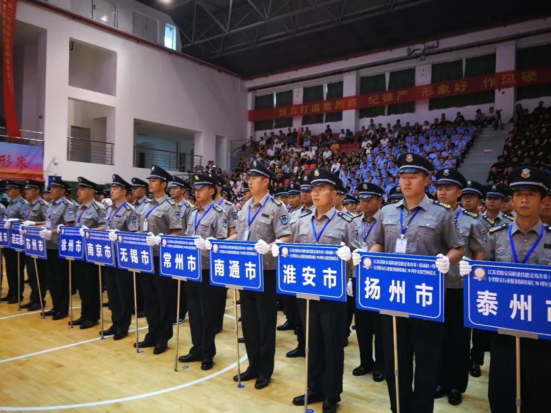 為更好的履行“保安勇?lián)?,忠誠保大慶”主題活動,有力推進和提升全省保安服務行業(yè)的人才隊伍建設、綜合業(yè)務技能和履職能力,更好地服務新中國成立70周年大慶安?;顒?,9月16日下午3點30分,由省公安廳,省人社廳,省總工會,共青團江蘇省委主辦,江蘇省保安協(xié)會承辦的“江蘇省保安員職業(yè)技能競賽決賽開幕式暨全省保安行業(yè)服務保障國慶70周年安保誓師大會”在江蘇省司法警官高等職業(yè)學校(鎮(zhèn)江)舉行。全省13個地級市13支代表隊117名保安員參加了決賽。開幕式由江蘇省保安協(xié)會會長秦軍主持,公安部三局顧巖處長、中保協(xié)第一副會長劉紹武、江蘇省公安廳黨委副書記副廳長尚建榮、省人社廳副廳長朱從良、省總工會副主席井良強、團省委副書記潘文卿、江蘇省監(jiān)獄管理局政治部主任袁誠、鎮(zhèn)江市副市長公安局長陳金觀等領導出席開幕式并講話。部分省、自治區(qū)、直轄市保安協(xié)會、公安機關分管領導和保安公司負責人參加安保誓師大會。淮安市公安局副局長唐衛(wèi)東、治安支隊政委顏志龍、巡特警支隊支隊長王彤、保安監(jiān)管大隊大隊長呂述山、淮安市保安服務總公司總經(jīng)理趙愛忠等領導參加了開幕儀式。開幕式上,全體保安人員,進行了“保安勇?lián)?,忠誠保大慶”集體宣誓。