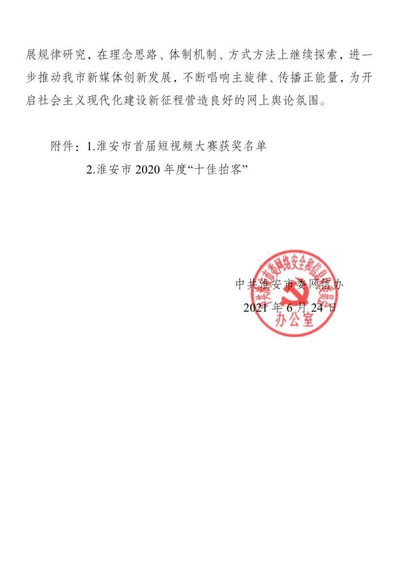 為宣傳貫徹落實習(xí)近平新時代中國特色社會主義思想,大力弘揚社會主義核心價值觀,聚焦展示淮安高水平全面建成小康社會進(jìn)程中取得的重大成就,彰顯淮安建設(shè)“綠色高地 樞紐新城”的精彩風(fēng)貌,推動全市網(wǎng)絡(luò)傳播力提升,淮安市委網(wǎng)信辦于 2020 年11 月組織開展了淮安市首屆短視頻大賽評選活動。本次評選分為競賽單元“美麗淮安 幸福家園”和特別競賽單元“暖心淮”、“抗疫故事”。經(jīng)組織申報、初步評選、綜合評審,全市共有68 件作品獲得一、二、三等獎及優(yōu)秀獎。